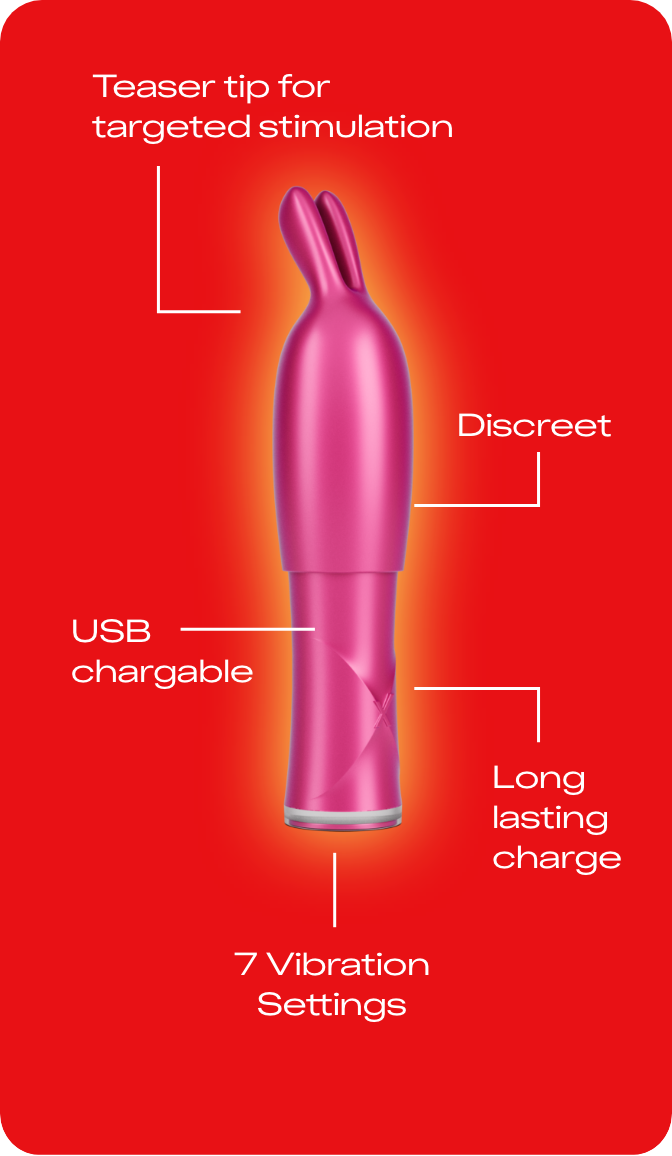 2. Pop the Teaser Tip onto the rounded end of the Vibrator by applying gentle pressure, until the Tip is nicely sitting on top of the Vibrator and ensure it is locked in place. Make sure you don’t pop it onto the flat-end of the Vibrator. Play with the various vibration intensity levels by pressing the X button, to experience a different targeted stimulation with the Teaser Tip. You can use the Teaser Tip anywhere you want on your/your partner's entire body (except the anus or vagina)- think penis, clitoris, vulva or nipples...!